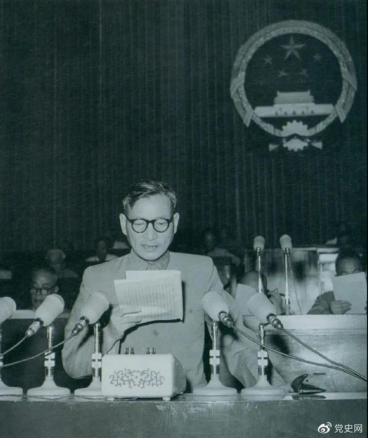1955年7月,陈云在一届全国人大二次会议上作坚持和改进粮食统购统销工作的报告。
