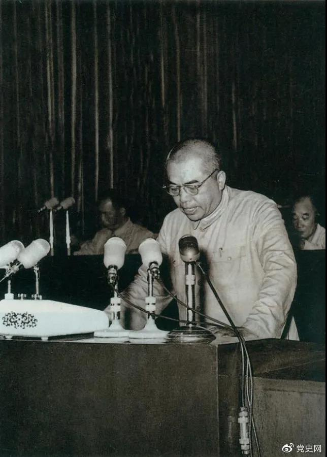 1955年7月30日,一届全国人大二次会议通过《中华人民共和国兵役法》。图为国防部部长彭德怀在会上作报告。