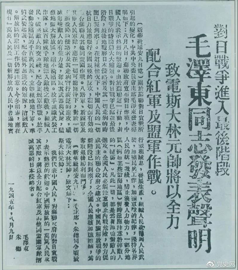 同日,毛泽东就苏联对日宣战发表声明。声明指出:中国人民热烈欢迎苏联对日宣战,最后地战胜日本侵略者及其一切走狗的时间已经到来了。中国人民的一切抗日力量应举行全国规模的反攻,密切而有效力地配合苏联及其他同盟国作战。八路军、新四军及其他人民军队,应在一切可能条件下,对于一切不愿投降的侵略者及其走狗实行广泛的进攻。这篇声明以《对日寇的最后一战》为题,收入《毛泽东选集》第三卷。