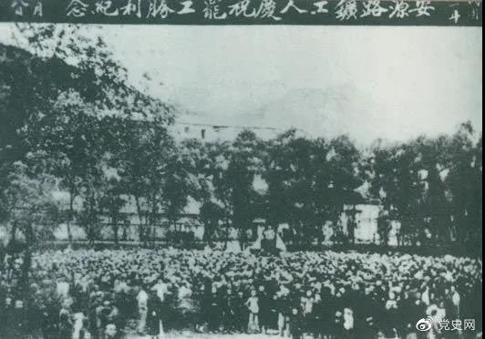 1922年9月14日-18日 安源路矿工人在毛泽东、李立三、刘少奇等组织领导下,举行罢工斗争,取得胜利。图为安源路矿工人庆祝罢工胜利。