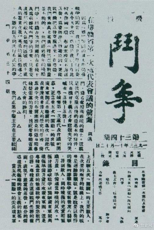 1933年11月5日,刘少奇主持中央苏区农业工会十二县查田大会,并作总结报告。图为《斗争》第34期刊登的目录。