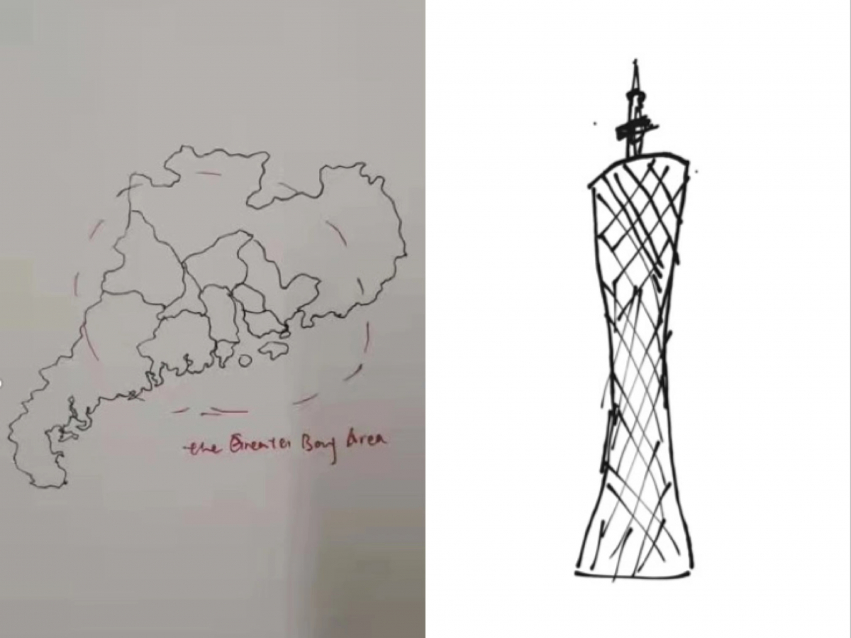 手绘的港珠澳大桥、粤港澳大湾区地图、广州塔
