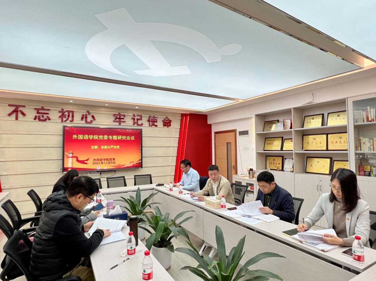 2021年11月8日上午,外国语学院党委会在外国语学院305会议室召开,专题研究全面从严治党工作。会议由学院党委书记黄山主持,院长许德金、院党委副书记黄涵梓及学院党委委员参加会议。