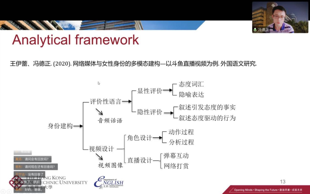 香港理工大学副教授冯德正博士的报告围绕关键词“超文化”(transculturality)和“多模态”(multi-modality)展开。冯德正博士首先从中学英语课本Han Meimei和Jim Green的故事、香港餐厅等典型例子出发,提出了超文化的概念,即东方与西方交汇、传统与现代融合、超越国别或区域限制的文化杂糅。接着,冯德正博士借助多模态语篇分析理论和评价理论,提出系统分析超文化身份构建的理论方法。他结合部分国内网站中的外国人网红案例,探讨了社交媒体上的超文化身份的多模态建构。之后,他以全球女性地位的嬗变为切入点,讨论了当代中国超文化的主要特征。最后,冯德正博士指出,在提高中国国家软实力、中国文化走出去的大背景下,研究融汇中外、贯通古今的超文化身份对构建新时代多模态中国话语体系、扩大中华文化影响力具有积极意义。
