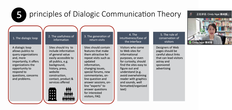香港理工大学副教授魏城璧博士的报告围绕关键词“对话式沟通理论”(Dialogical Communication Theory)展开。魏城璧博士指出,随着传播资讯科技的发展、新媒体与社交媒体的普及,对话式沟通研究与日俱增。2015年,对话式沟通理论是新媒体研究领域的第二热门理论,到2021年,它已经成为最热门的理论。接着,魏城璧副教授向听众介绍了Kent与Taylor提出的对话式沟通理论,结合具体的例子解读了该理论的五大原则:对话框设计、信息有效性、再次访问的生成、界面友好性、访客保留。最后,魏城璧博士指出对话式沟通理论具有很强的生命力,该理论将在跨国社交媒体研究领域焕发出新的活力。