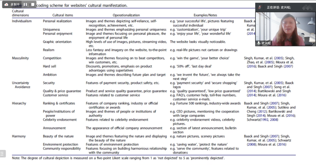 对外经济贸易大学史兴松教授的报告围绕关键词“跨文化适应”(cross-cultural adaptation)展开。史兴松教授首先介绍了跨文化商务语境下中外企业商务沟通的内涵、特征、文化属性、影响因素及跨文化调适水平。接着,她结合自己的研究为大家讲解了跨文化适应理论在商务语境中的应用,包括影响驻外商务人员跨文化适应的因素、中国大品牌的国际版网站在跨文化适应方面的调整、国外网络如何在中国社交媒体中进行跨文化适应。最后,史兴松教授提出了跨文化适应对商务英语教学及商务话语实践的启示。