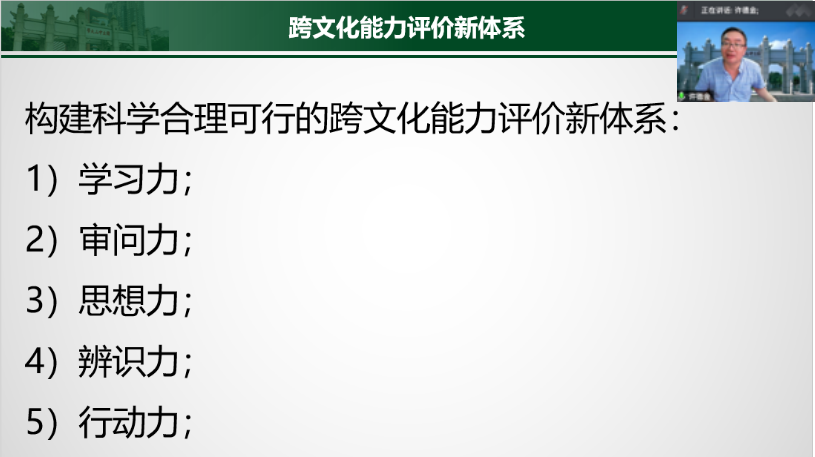 304永利许德金教授的报告围绕关键词“跨文化能力评价”(intercultural competence evaluation)展开。许德金教授结合新文科、新外语的大语境,从国家战略的层面切入,首先阐述了21世纪新文科与新外语的内涵与特色,提出“新”在理念,即主动求变,交叉融合,强调创新。接着,许德金教授系统述评了学界现有的相关研究,分析总结了国内外学者在跨文化能力发展与评价方面做出的贡献和存在的问题。他认为,现有研究一般从跨文化交际的“得体性”和“有效性”两个方面对行动者的跨文化交际能力进行评价,其着眼点在于评价行动者进行跨文化交际的结果,是典型的结果导向。鉴于此,许德金教授提出,跨文化能力评价也应该将过程评价纳入评价体系,并首次提出跨文化能力过程评价应重点关注5个维度,即:态度、知识、意识、时间及空间。最后,许教授创造性地提出构建五位一体的新的跨文化能力评价体系:即由学习力、审问力、思想力、辨识力和行动力集聚而成的跨文化能力评价新体系,并以此为基础,编制出新的跨文化能力评价量表,从而从理论和实践两个方面对行动者的跨文化能力进行质性和量化的科学有效评价。