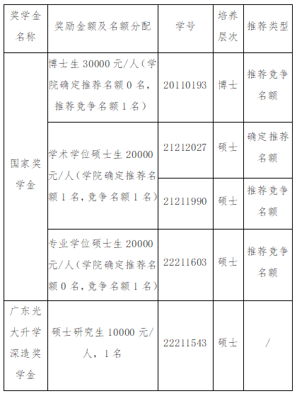 根据《关于做好2022学年研究生各项奖学金评选工作的通知》(研院〔2022〕133号)的要求, 经个人申请、班级初评、学院研究生奖学金评审委员会讨论,现将2022年度研究生奖学金评选结果公示如下: