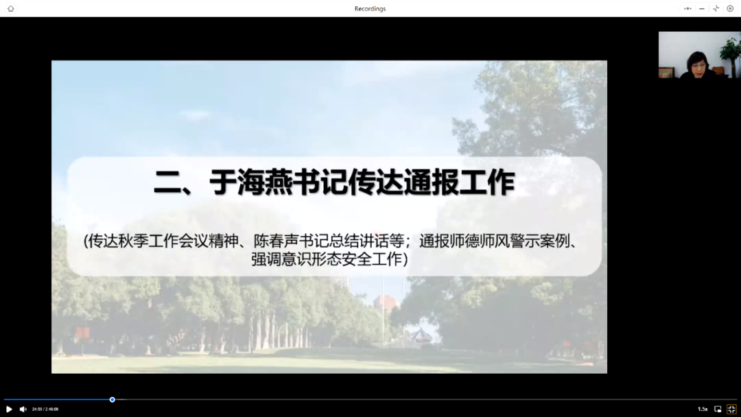 最后,于海燕书记通报了教育部公开的高校教师师德师风警示案例,强调意识形态安全工作,提醒教职工恪守师德、严于律己,注意防范宗教渗透危险。