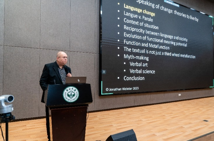 Jonathan Webster教授发表了一场题为“Speaking of change: theories to live by”的主旨报告。他指出,作为功能意义潜势的语言是通过语境中的话语活动而演化的。除了概念和人际功能以外,韩礼德独特地增加了第三种纯理功能,即语篇纯理功能。文本元功能是人类语言所固有的,韩礼德将语篇描述为具有自己的结构,即语篇强加于物质世界的结构。