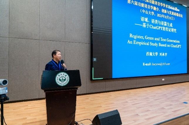 刘承宇教授的报告题目为“语域、语类与语篇生成:基于 ChatGPT 的实证研究”。他明确指出,作为一种适用语言学理论,系统功能语言学长期以来一直关注面向人工智能的自然语言处理与语篇生成研究。ChatGPT 从本质上说是一种基于人工智能和自然语言处理技术的语篇生成工具。他运用系统功能语言学的语域与语类理论,通过设计多种语境变量,尝试在 ChatGPT上生成各种类型的语篇,开展语篇生成的实证研究,旨在探索这一自然语言处理工具在语篇生成方面的“能”与“效”,对如何将其有效运用于外语教学提出建议与展望。