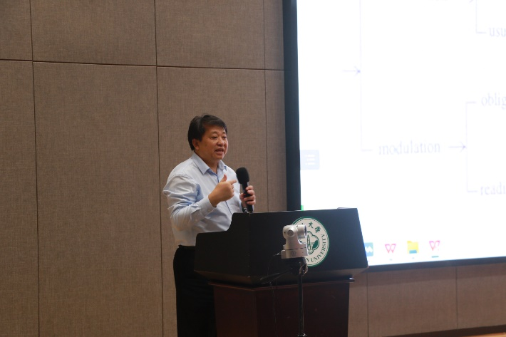徐玉臣教授的报告题目为“情态的语义逻辑:再议语义三分论对情态语义的解释”。他在汇报中提到,Lyons 试图用语言哲学家 Hare 的语义三分论来解释情态的主观性和客观性,但他的解释受到 Portner 的质疑。为了回应这一质疑,我们需要重新审视语义三分论对情态语义的解释。为了寻求对情态语义更为合理的理论解释,他解剖了情态语义的三维内生结构,把情态的语义取向跟语义三分论中“签批”这个语义因子相关联,把情态的其它两个语义维度跟语义三分论中“语气”这个语义因子相关联,系统解释了情态语义的内生结构,从而克服了 Lyons 观点的底层逻辑不一致问题,回应了 Portner 的质疑。