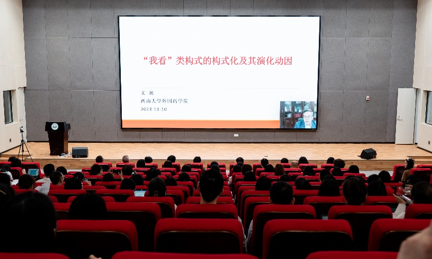 文旭教授的报告题目为“‘我看’结构的构式化及其演化动因”。他借助北京大学古代汉语语料库,以历时构式语法视角,运用构式化理论,从“我看”中“看”的语义及“我”与“看”的结构关系两个方面,分析了主谓结构“我看”的构式化过程。通过对主观性标记构式“我看”的分析,揭示“X 看”的构式化与构式演化规律。该研究对充实和完善汉语语法构式的构式化理论具有一定意义,也为主观性标记的研究提供了新的视角。
