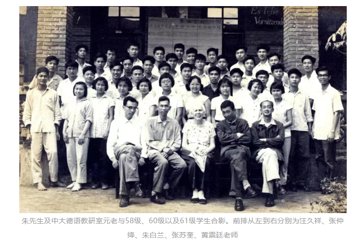 当年的德语学生学习条件较差,听力教材只有一套“灵格风”,朱先生就挤出时间,为二年级以上学生录制听力材料,保证学生听力内容的多样化;当年德语学习的工具书奇缺,个别学生能碰巧买到的词典,也是解放前出版的。朱先生就提议编写,用自己的稿费从德国买回权威的Duden词典,选定词条,大家分工合作,共同努力,在短时间内集体完成了《简明德汉词典》,于1963年由北京商务印书馆出版面世。这是我国解放后出版的第一本德汉词典,不但填补了德语工具书出版的空白,也成了那个年代全国德语学生的首选工具书。德语专业从1964年起开始扩招,由一个班变为两个班,每班人数由十五增至二十人。一下子一个年级有了40个德语学生!1965年学制改为五年后,在读的德语学生共有五个年级,七个班,学生人数达到113人。笔者1961年入学,后又赶上学制改为五年,有幸经历和感受当时专业的飞速发展,见证了德语专业历史上的高光时刻。