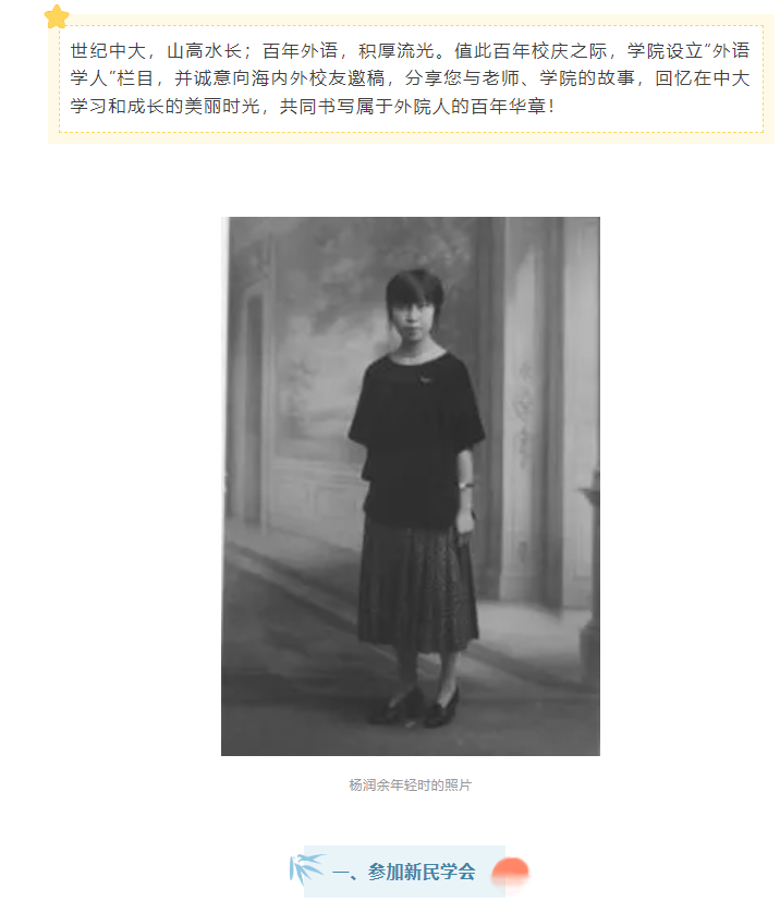 杨润余教授1917年在湖南省立第一女子师范学校(因校址的关系又称稻田师范,当时长沙最高级的女子学府)毕业,留在师范幼儿园当老师。当时的长沙,是个进步思想比较活跃的地方,她也很关心国家大事和中国的前途。1918年,经陈书农介绍,她加入了毛泽东、蔡和森发起的革命青年团体“新民学会”,是稻田师范的两名会员之一(另一位是任培道)。据李维汉 1979年的文章,杨先生是包括蔡畅、向警予在内的17名女性会员之一,而全部会员则是66名。先生回忆,在稻田师范上学时,曾和同学们一起帮助女同学黄林彰逃避封建包办婚姻,半夜替她搭梯子逃出校园。黄逃到上海又到日本半工半读,后来成为1930年代进步的女作家之一,笔名白薇。
