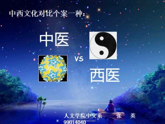 2003年,我在全校开设公选课《跨文化交流》,采用了“难题教学法PBL”和“任务型教学法TBL”的改进版。我不局限于某一本教材,而是采用导学导思导干的路径,广泛命题广泛取材,放手让学生自选与跨文化交流主题相关的子课题,旨在把英语作为工具,应用到对该课题的选材、制作、阐释、展示、评价全过程。结果,学生作品精彩纷呈。中文系张英同学结合当时“非典SARS”大流行的背景,设计制作《中西医比较》,其选题、选材、设计、制作、演讲全面高水平,足以到联合国世界卫生组织去演讲。