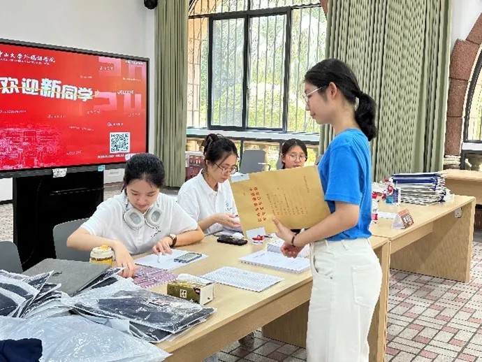 八月底,外国语学院2024级新生报到,迎新工作顺利开展。百年校庆之际,我院迎来87名本科生新生。在志愿者的协助下,新生及家长们来到外国语学院一楼校友之家完成签到流程,并与在旁的院领导和辅导员就开学事项进行交流,最后新生们与家长怀揣希望和期许在签名墙前拍照留念,记录下整装待发、奔赴下一场学海的时刻。