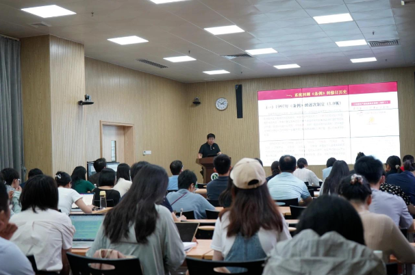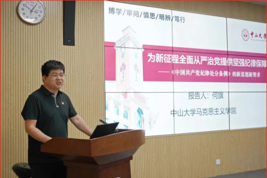 何旗副教授以《为新征程全面从严治党提供坚强纪律保证——<中国共产党纪律处分条例>的新思想新要求》为题,从系统回顾《条例》的修订历史出发,围绕深刻理解新《条例》的时代特色、准确把握新《条例》的结构框架、认真贯彻新《条例》的实践要求等方面进行了讲授,通过理论指导和案例分析的方式对《条例》进行了深入浅出的讲解,帮助大家准确把握新《条例》修订的主旨要义。