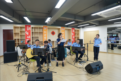 在IN乐队工作室,师生们一起欣赏乐队原创歌曲《国门名片》,青春澎湃的歌声、深入人心的歌词让大家感受到了新时代移民管理警察的朝气蓬勃与忠诚初心。学院的青年学子们与IN乐队共同唱起《一路生花》,将现场氛围推上高潮。