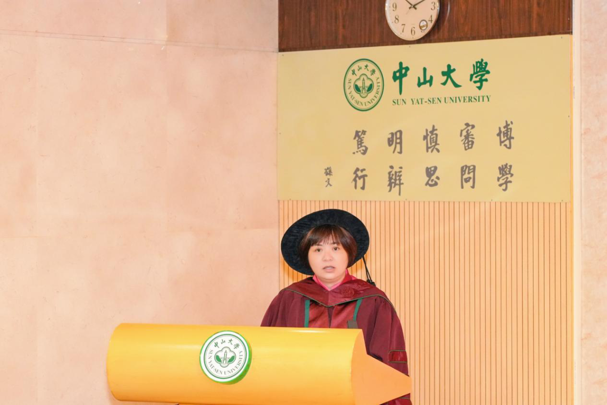 2021级外国语言文学专业博士研究生毕业生代表高楠发言。他以乔布斯的“连接点”“爱与失去”“生命轮回”三个故事为脉络,分享读博四年的成长感悟。他谈到,初入学术门径时曾在文献研读、组会汇报中屡屡碰壁,但正是这些看似零散的努力最终构筑了知识根基,印证了“当下积累终将串联成未来方向”的真理;面对科研路上的拒稿与失败,支撑他走下去的是“跌倒后仍选择站起”的信念,呼吁师弟师妹善待逆境中坚持的自己;在时代焦虑与现实压力下,他以“生命有限”警示勿困于外界评价,应倾听内心声音,忠于本心选择。最后,他寄语毕业生们相信努力的意义,在低谷中坚守自我,以清醒笃定的姿态奔赴未来,让康乐园的奋斗岁月成为照亮人生的星光。