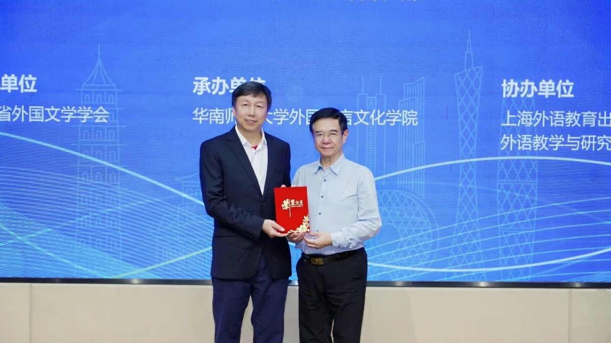 2025年11月9号,黎志敏代表广东省外国文学学会为区鉷教授颁发广东省外国文学学会“终生成就奖”证书