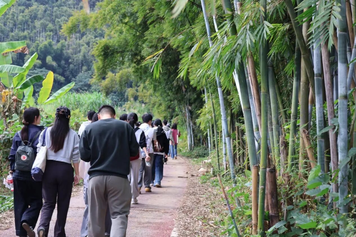 种植结束后,队伍沿山间小径徒步。同学们走走停停,不时被路边的景色吸引。山间竹林茂密,溪水从石桥下流过,偶尔能听见远处传来的鸡鸣犬吠。不少人驻足小路,用手机拍下眼前的风景。