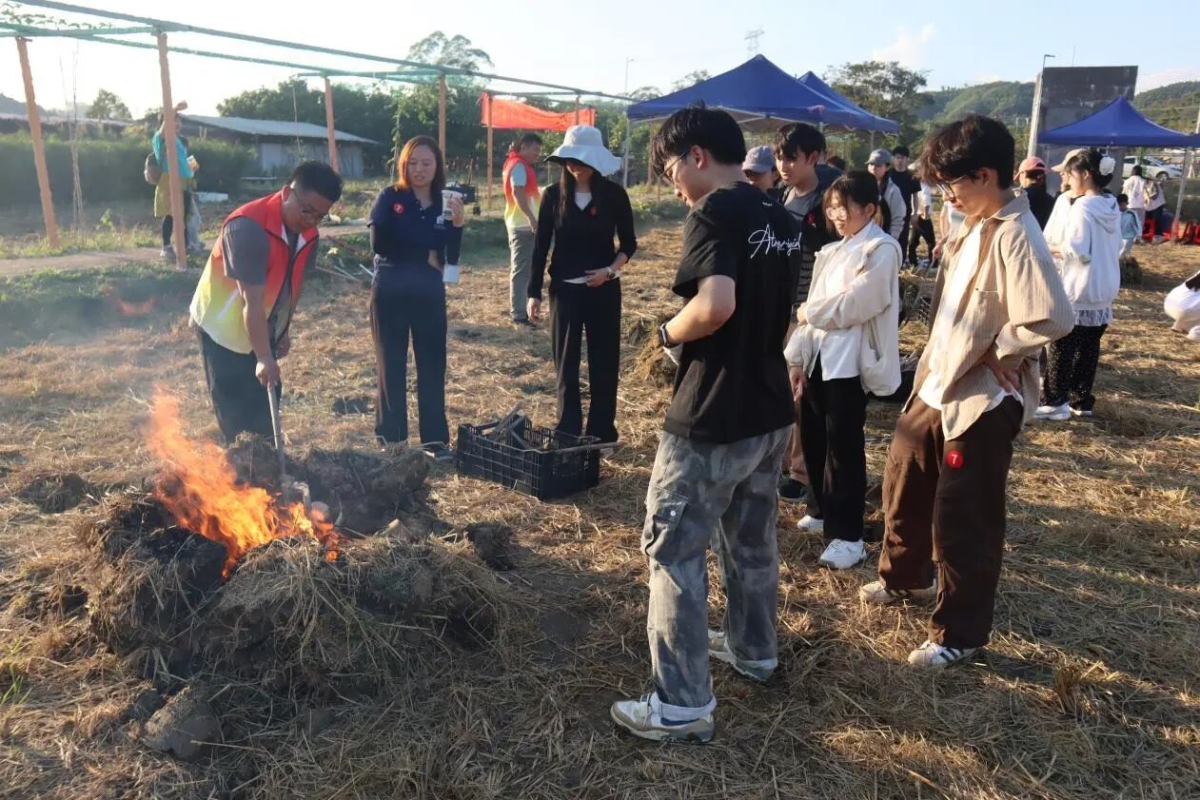 稍作休适后,同学们来到了当日的最后一个活动。在师傅老练的示范下,同学们认真学习了挖窑、垒土、控火等传统手艺。从挑选柴火、掌握火候,到窑烤红薯、焖制窑鸡,每一个步骤都需要耐心与协作。随着天色渐晚,土窑中的火焰越烧越旺,跳动的火光映照在一张张专注而认真的脸庞上,也为微凉的傍晚增添了温暖的底色。窑中渐渐飘出香气,混着淡淡的炊烟,在渐沉的暮色里,静静铺开一幅温暖而安宁的画面。