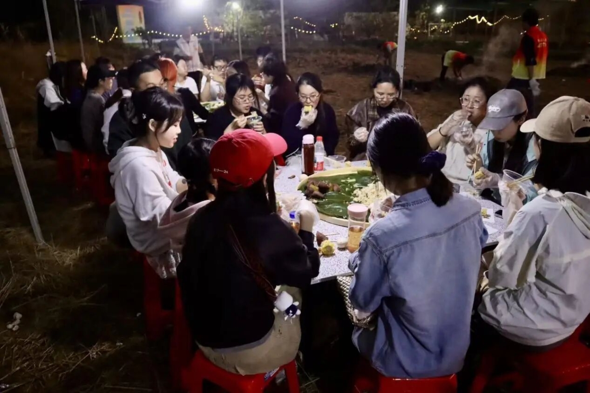 伴着晚霞,一盘盘五彩斑斓的特色手抓饭被端上餐桌。师生同学们围坐在一起,分享着这顿在营地的晚餐。随后,大家期待已久的窑鸡也被端了上来。香气弥漫中,交谈声、笑声融在一起,成为一天里最温暖的时刻。