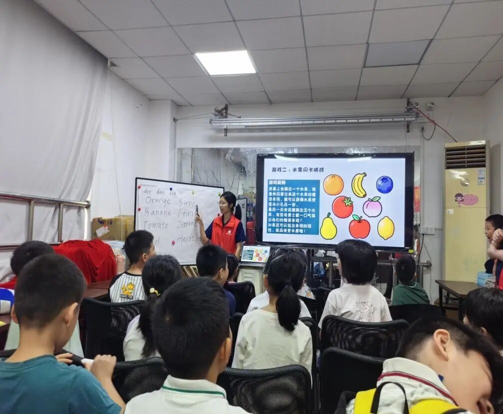 德语课堂以水果派对欢乐收尾,志愿者通过图文并茂的趣味形式,教孩子们认识“Birne(梨)”“Pfirsich(桃子)”等德语水果单词。孩子们紧跟节奏认真跟读、大声朗读,稚嫩又认真的发音里,满是对全新语言的好奇与探索欲。整堂课程中,孩子们始终热情高涨、积极互动,在轻松的氛围中牢牢掌握所学知识。
