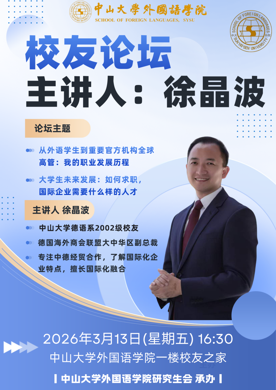 2026年3月13日下午,外国语学院校友之家迎来了一场别开生面的“校友论坛”。本次论坛特邀外国语学院德语系2002级校友、德国海外商会联盟大中华区副总裁徐晶波作为主讲嘉宾,以“在变化中成长——过去20年的职业探索与AI时代的未来机会”为主题,结合其二十年职业探索历程,深入剖析AI时代外语人才的机遇与挑战,为在场同学们做了一场精彩的分享。学院党委副书记金凤、德语系主任杨劲教授、研究生辅导员戴震,以及学院50余名同学参加论坛。论坛由2025级外国语言学及应用语言学专业张靖岚同学主持。