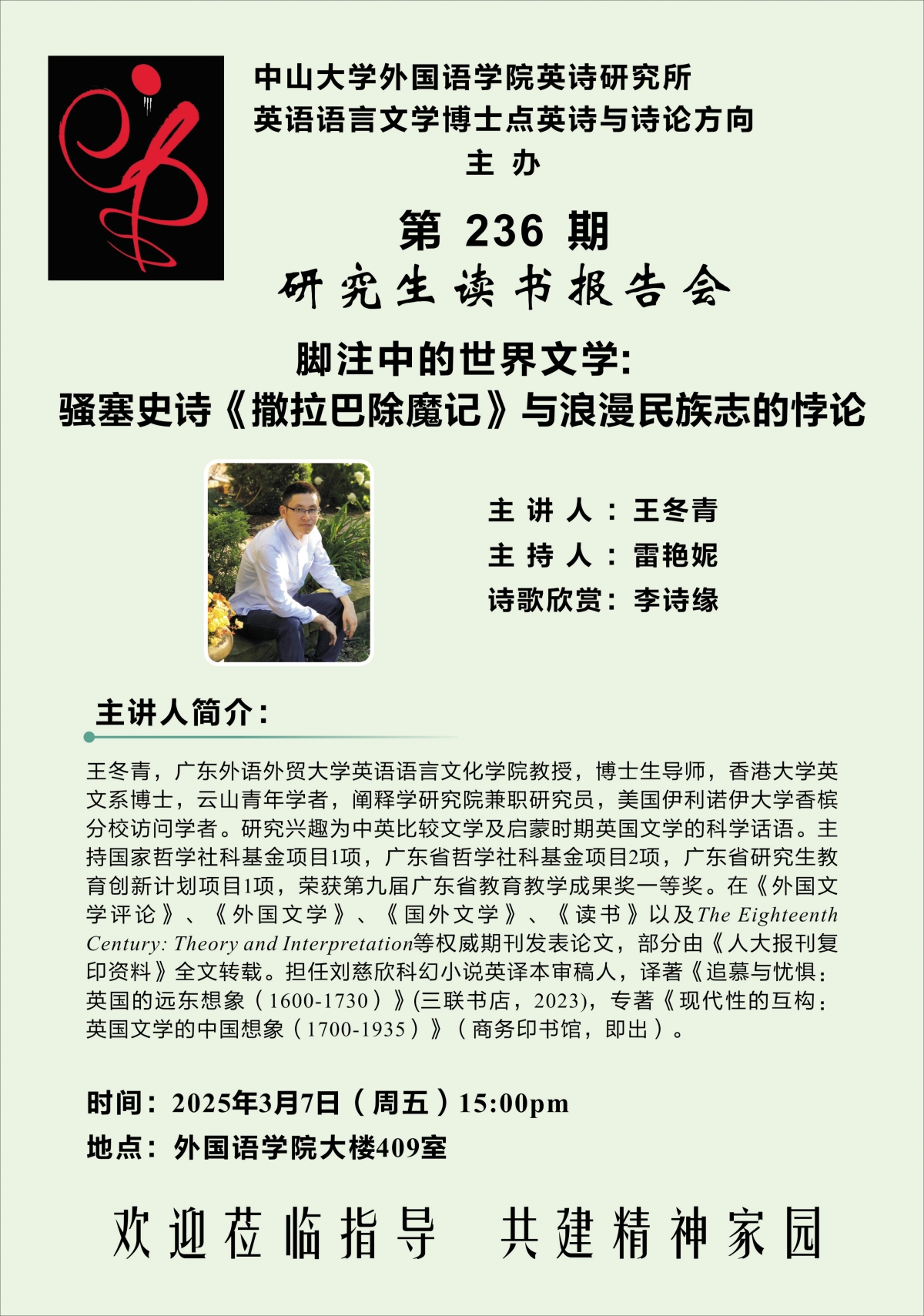 导航痕迹 304永利外国语学院 第236期英诗研究所研究生读书报告会 "脚注中的世界文学:骚塞史诗《撒拉巴除魔记》与浪漫民族志的悖论” 扫描此二维码分享 第236期英诗研究所研究生读书报告会 "脚注中的世界文学:骚塞史诗《撒拉巴除魔记》与浪漫民族志的悖论” 发布人:罗锦芬 发布日期:2025-03-04 活动时间 2025年03月07日 15:00 - 2025年03月07日 17:00 活动地址 外国语学院409会议室